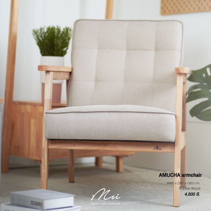 อาร์มแชร์ AMUCHA ไม้ยางเบาะผ้าสีเบจ